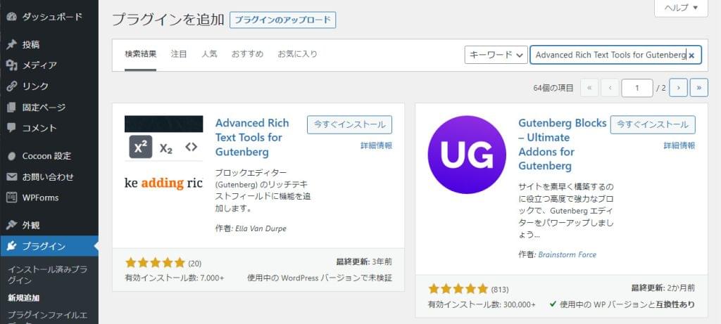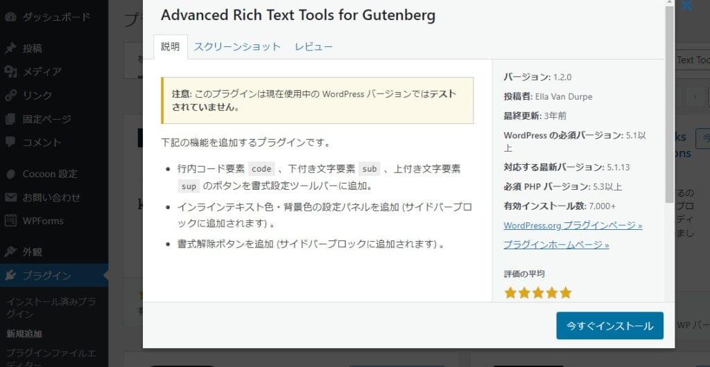 プラグインの追加画面右上に表示される「キーワード」窓に Advanced Rich Text Tools for Gutenberg と入力します。すると、目的のプラグインが下部にすぐ現れます。アイコンとプラグインの名前、簡単な説明と作者名が並んでいます。その下には評価を示す☆印、五つ星ですね。