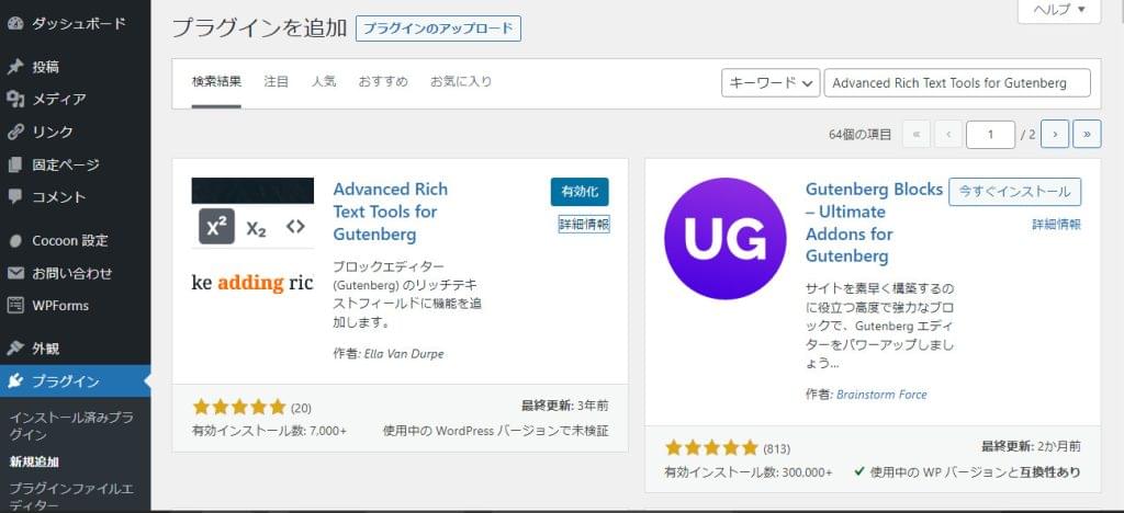 すぐに有効化されます。インストールしているプラグイン一覧画面に変わりますので、一番上にいまインストールした Advanced Rich Text Tools for Gutenberg があることを確認してください。
