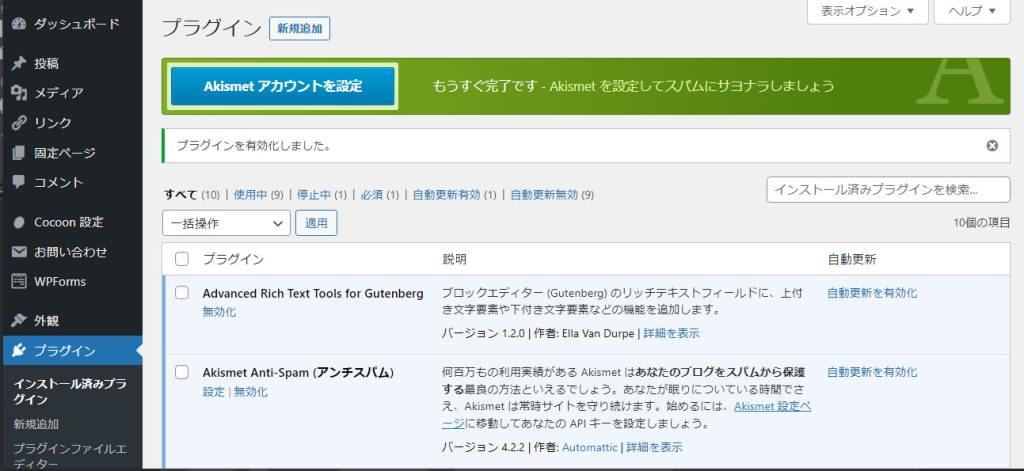 インストールは数秒で完了します。成功するとプラグイン追加画面に表示されていた「今すぐインストール」の文字が「有効化」に変わります。クリックして有効化しましょう。