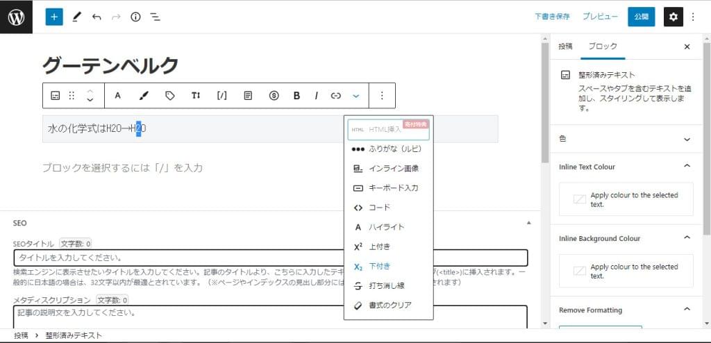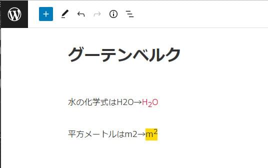 それだけでなく、H2Oのような「下付き文字(subscript)」、m2のような「上付き文字(superscript)」も表現できるようになります。