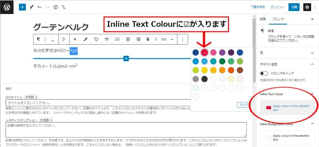 部分的な文字色変更の設定ができました。H2Oは文字色赤に、m2は背景色イエローになっていますね。