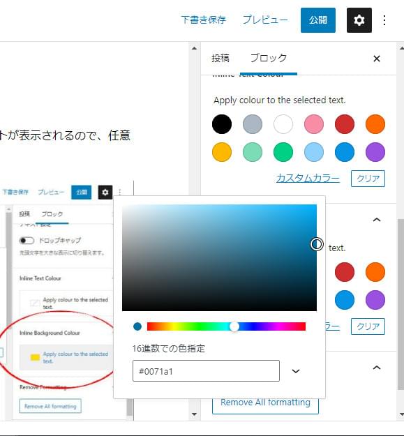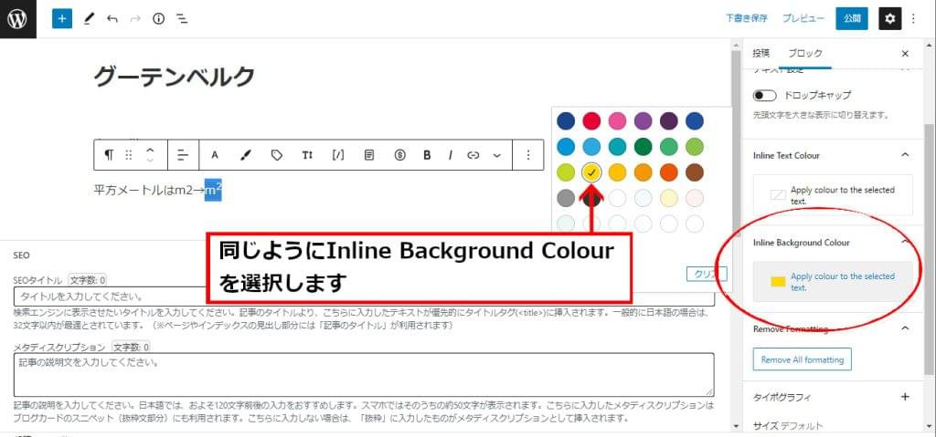 背景色についても操作方法は同じです。 「Inline Text Colour」の下に表示されている「Inline Background Colour」を使って、カラーを選択してください。