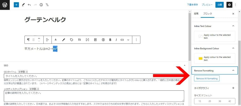もしここで説明したような文字の色付け、背景色の色付け、上付き・下付き表示などを解除したい場合は、その部分をカーソルで選択した状態で、青文字で表示されている「Remove Formatting」ボタンを押してください。