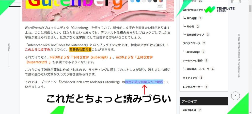 「Advanced Rich Text Tools for Gutenberg」というプラグインを使えば、特定の文字だけを選択してこのように文字色だけでなく、背景色も変えることができます。
